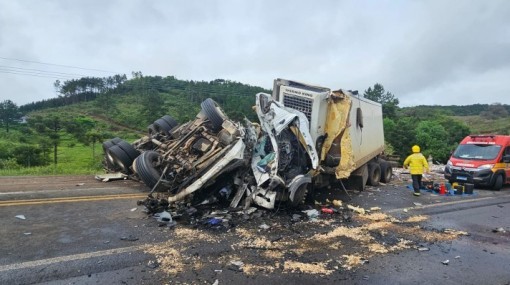 Dois caminhoneiros morreram na manhã desta sexta-feira (08), após os caminhões baterem frontalmente na BR-282 em São José do Cerrito. O helicóptero Águia da Pol...
