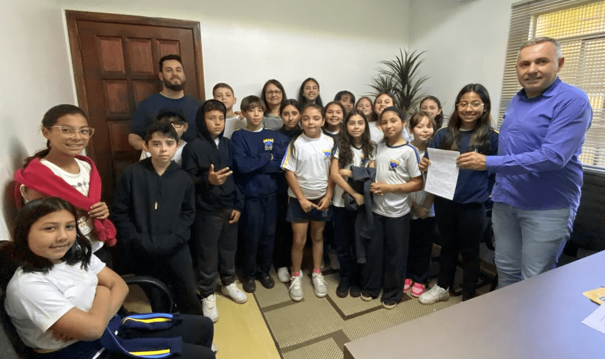 Nesta terça-feira (14), o chefe do Executivo Municipal Michel Moreira da Silva recebeu em seu gabinete uma visita especial, os alunos do 5º ano do Núcleo Municipal José de Anchieta acompanhados pela professora Joseane. A visita teve como objetivo apresentar um projeto de trânsito desenvolvido pelos estudantes em sala de aula.