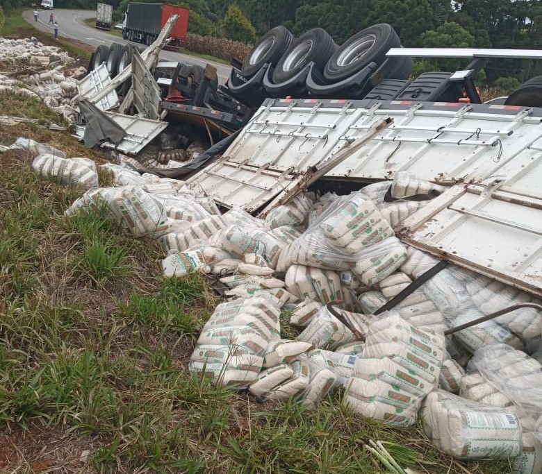 Na tarde deste sábado (12) aconteceu um capotamento de um caminhão bitrem com carga de arroz na BR-470 no trevo de acesso a localidade de Marombas em Brunópolis.