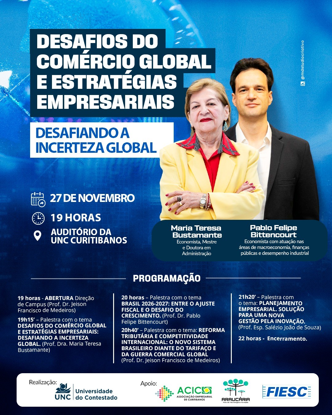 Na próxima quinta-feira dia 27 às 19h, vai ser realizado no Auditório da UNC Curitibanos, o evento “Desafios do Comércio Global e Estratégias Empresariais: Desafiando a Incerteza Global”. A programação reúne especialistas para discutir o cenário econômico internacional e seus impactos no ambiente empresarial brasileiro.
