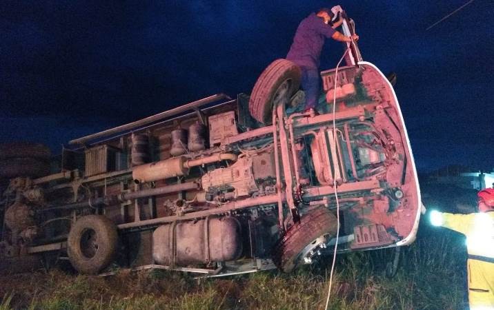 De acordo com os bombeiros, o caminhão estava sendo conduzido por um homem de 29 anos, o mesmo apresentava fratura na perna e ombro esquerdo, sendo retirado pela equipe da Concessionária Autopista Planalto Sul estava efetuando atendimento da vítima, a guarnição dos bombeiros auxiliaram e também estava no caminhão um jovem de 18 anos, o mesmo estava fora do veículo sem nenhuma lesão.
