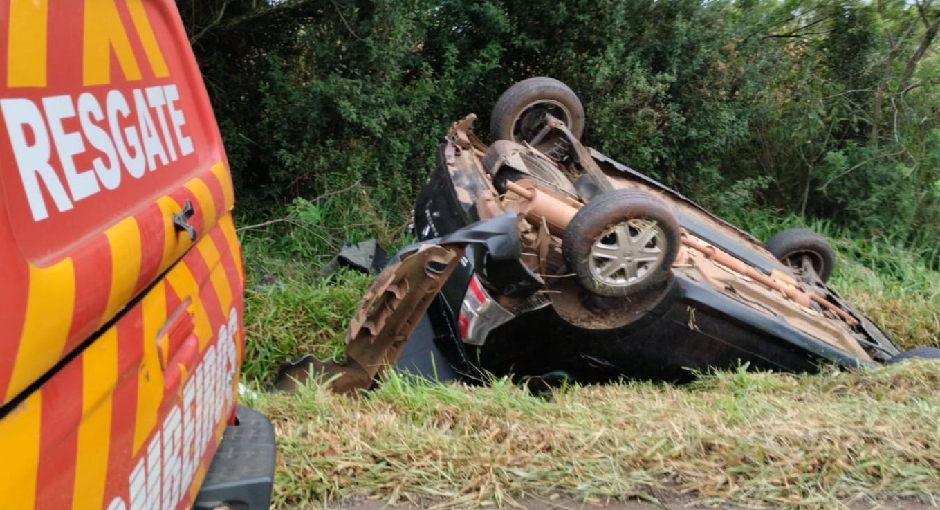 Na tarde deste domingo (07), o Corpo de Bombeiros atendeu a uma saída de pista seguida de capotamento de um veículo Sandero com placas de Curitibanos na BR-470 próximo a Ponte do Marombas em Curitibanos.