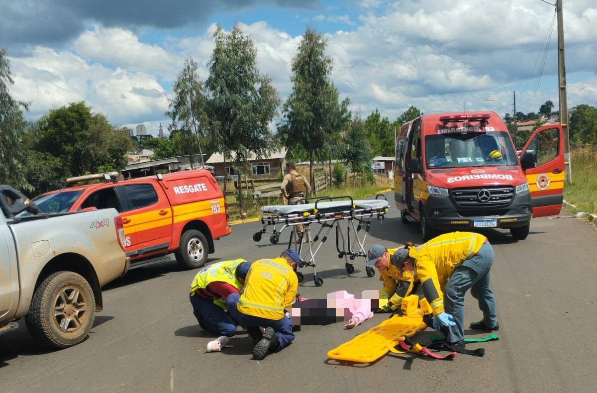 A motociclista uma mulher de 37 anos foi encaminhada ao hospital com suspeita de fratura na perna direita. Foto: Corpo de Bombeiros Militar de Curitibanos.