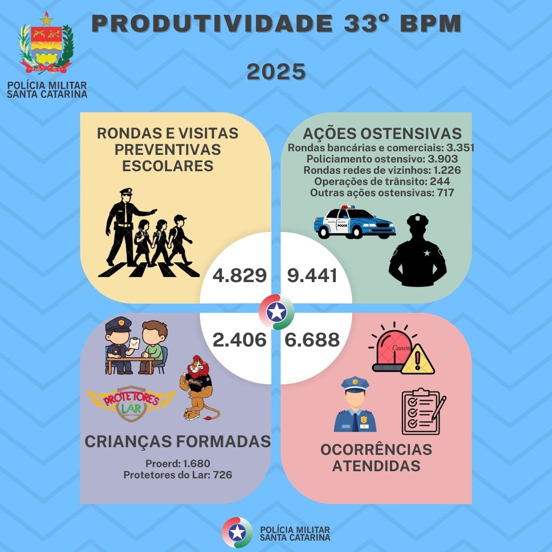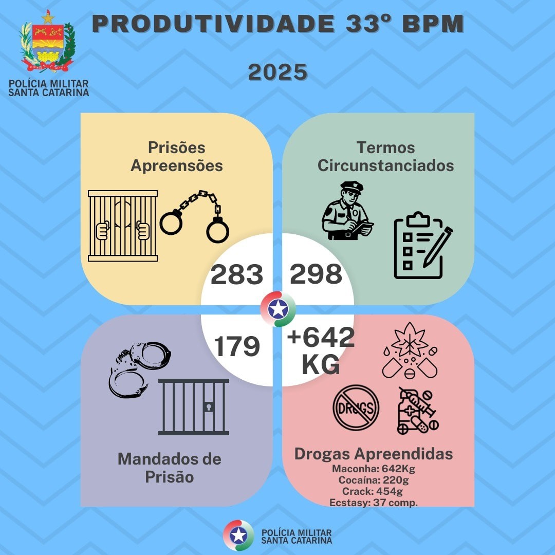 O 33° Batalhão de Polícia Militar apresenta dados referentes aos atendimentos prestados neste ano de 2025, precisamente até 15 de dezembro em toda a área que abrange sete municípios de Frei Rogério, Lebon Régis, Santa Cecília, Timbó Grande, Ponte Alta do Norte, São Cristóvão do Sul e Curitibanos.