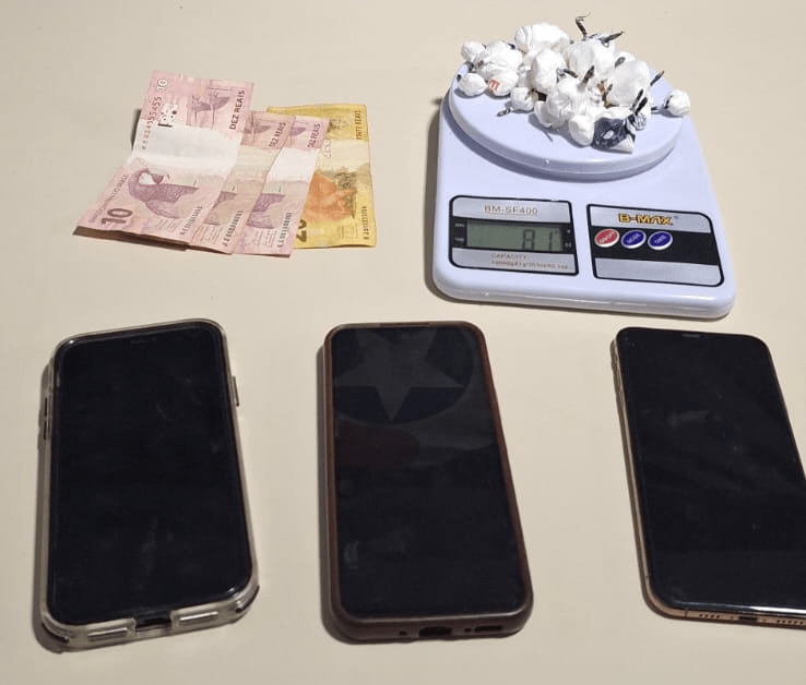 Já na busca veicular foram localizadas no porta-luvas do carro uma sacola contendo 34 porções de cocaína, embaladas e prontas para a comercialização, além de uma pequena porção de maconha. A pesagem total da droga apreendida indicou 81 gramas de cocaína, distribuídas em embalagens de 5 e 1 grama e 7 gramas de maconha.