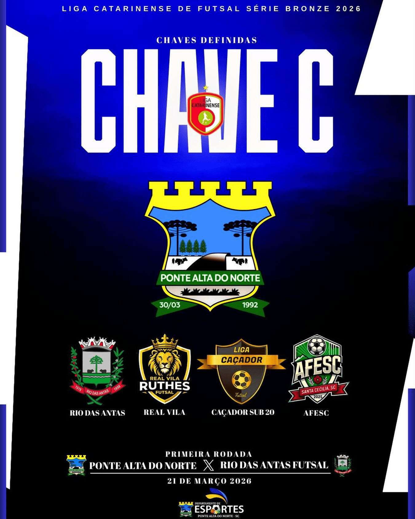A estreia de Ponte Alta do Norte já tem data marcada para dia 21 de março, contra a equipe de Rio das Antas, em um duelo que abre oficialmente a nova caminhada do município no futsal estadual.