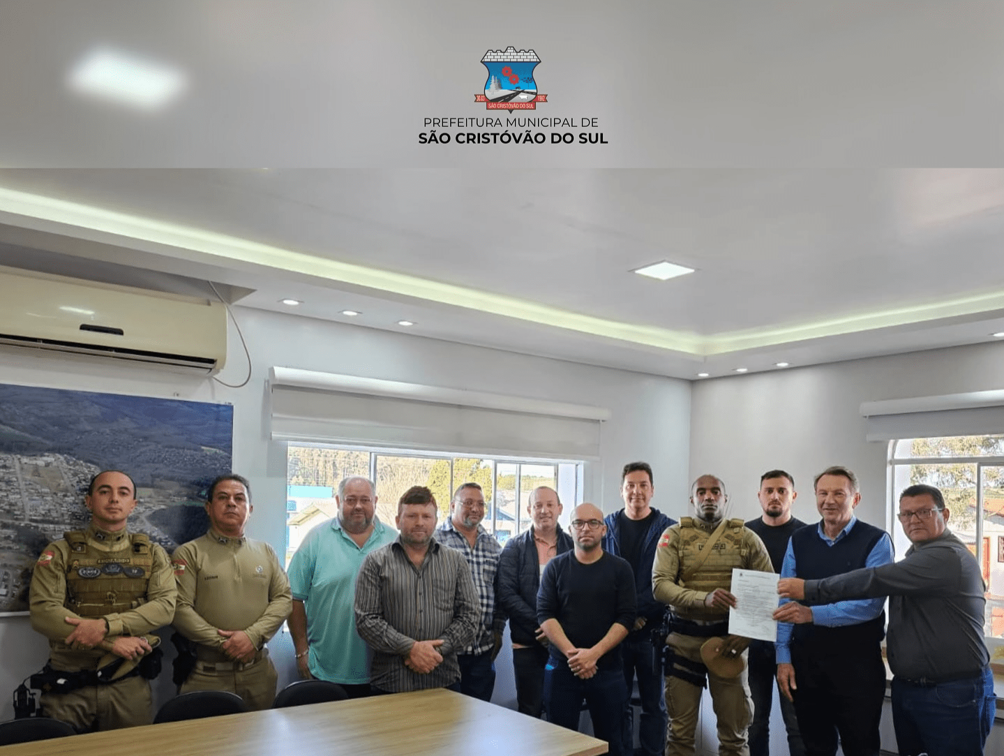 A pedido do prefeito do município de São Cristóvão do Sul, Jaime Cesca foi realizada na tarde desta quarta-feira (16), uma reunião no gabinete do prefeito que contou com a presença do Tenente Coronel Rodrigues e comandante do 33º Batalhão da PM de Curitibanos, o 1º Sargento Leonir, responsável pelo grupamento da PM em São Cristóvão do Sul e o Sargento Eduardo do setor de Planejamento do 33º BPM, do Executivo e do Legislativo com objetivo de debater sobre a segurança pública no munícipio.