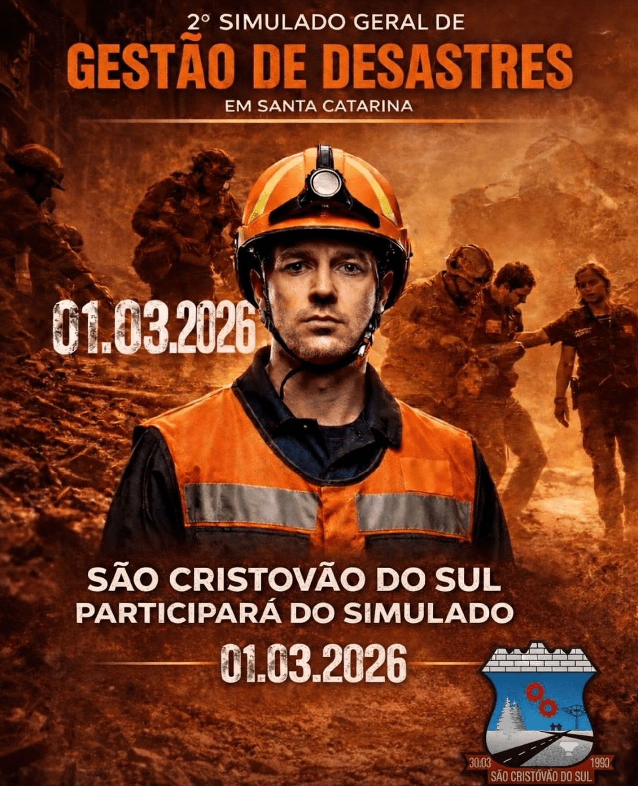 Neste domingo (01) a partir das 8h, todo o estado de Santa Catarina participa da segunda edição do maior simulado de desastres já realizado pela Defesa Civil de Santa Catarina e o município de São Cristóvão do Sul participará. A ação mobiliza órgãos públicos, forças de segurança, equipes de resgate e a população em um grande exercício de preparação para emergências.